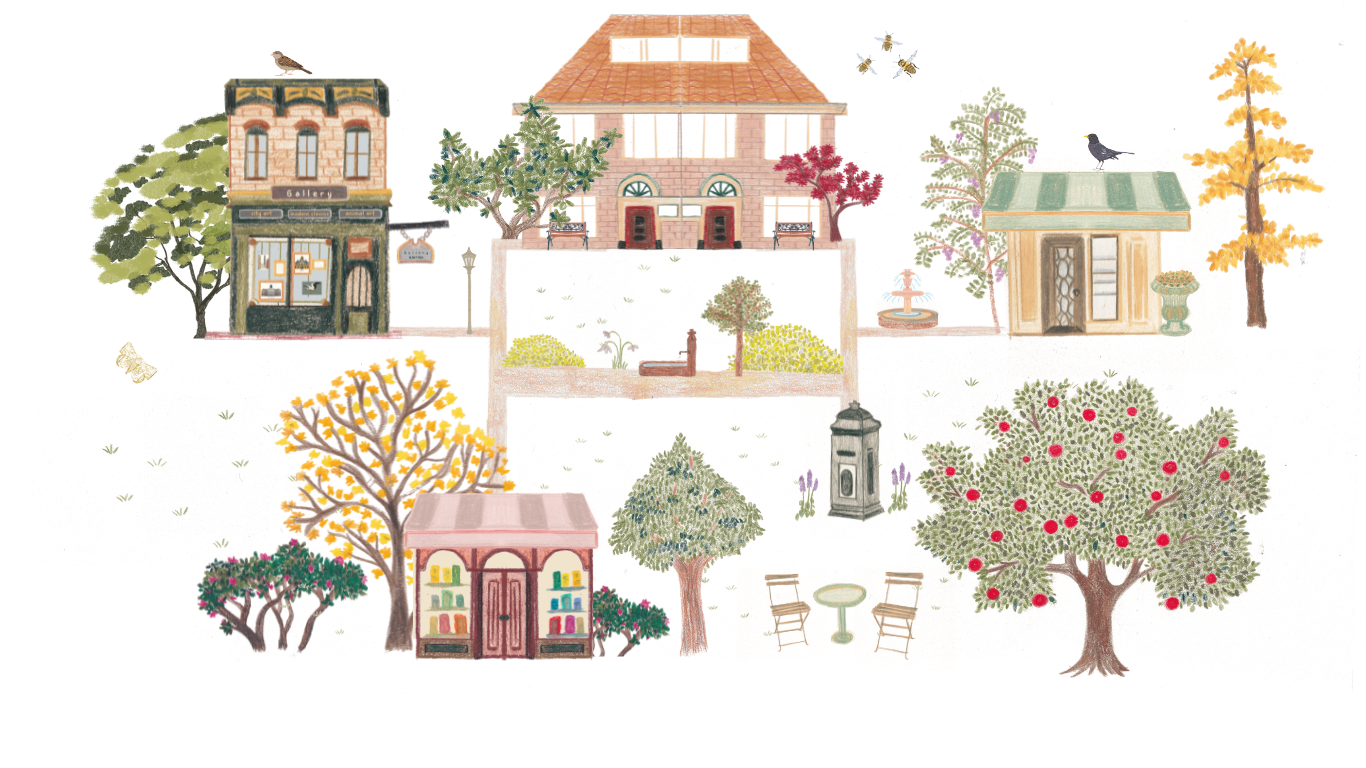 Where trees whisper, sketchbooks breathe, and tiny stories hide in every corner. Follow the winding paths, peek inside the warm glow of the gallery windows, or wander toward the studio where new ideas are born in pencil lines and watercolor washes. Explore with curiosity and wonder.